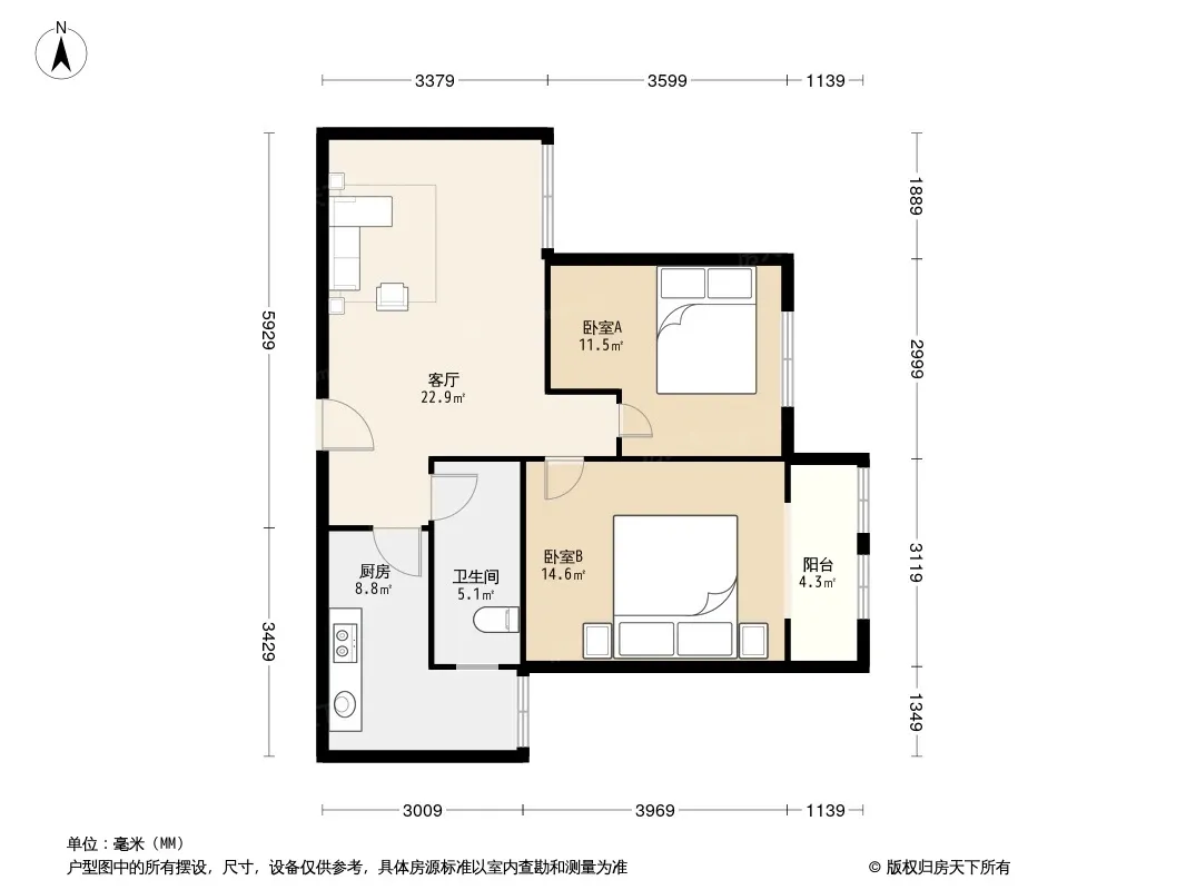 户型齐全,主打户型方正,明卫,明厨,主卧朝南二居