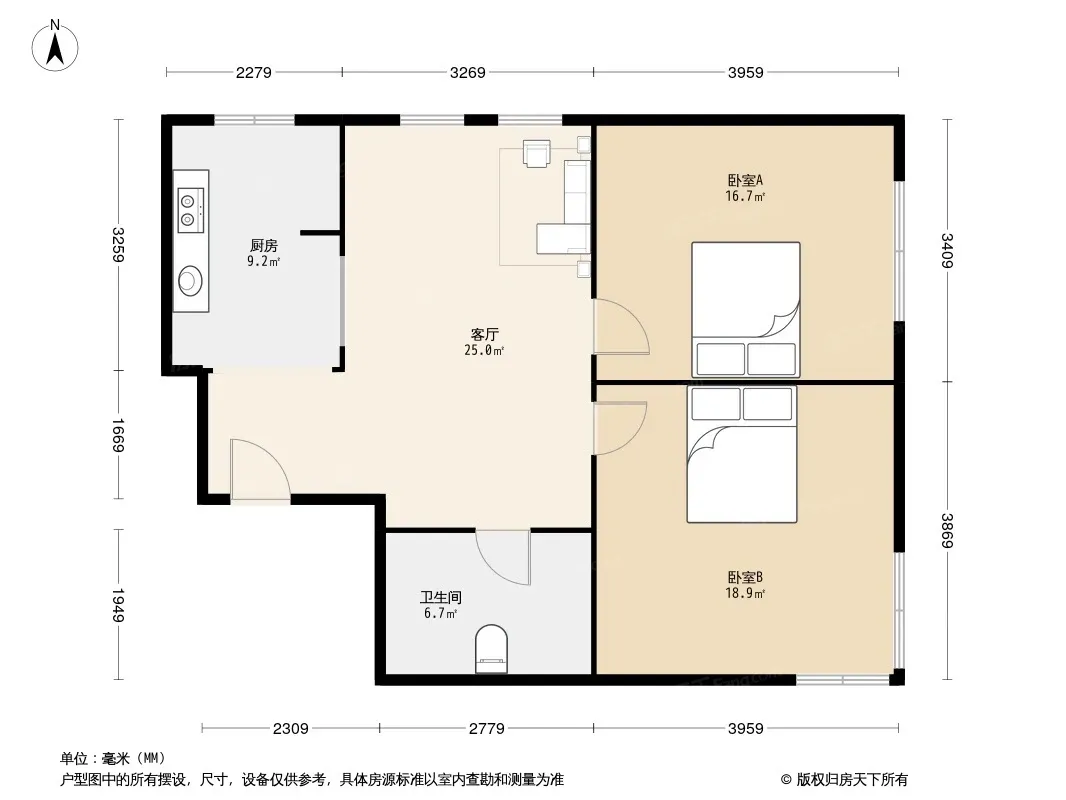 户型齐全,主打明厨,客厅朝南,主卧朝南二居