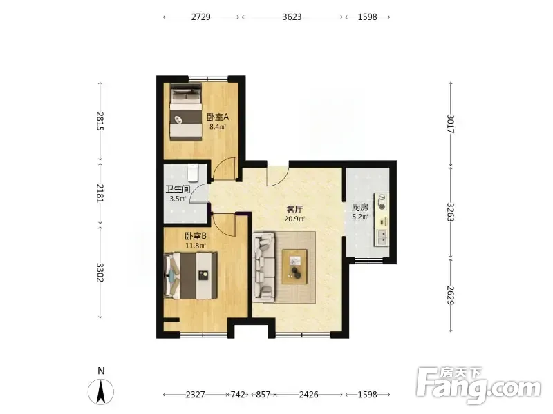 户型齐全,主打户型方正,明厨,客厅朝南,主卧朝南二居