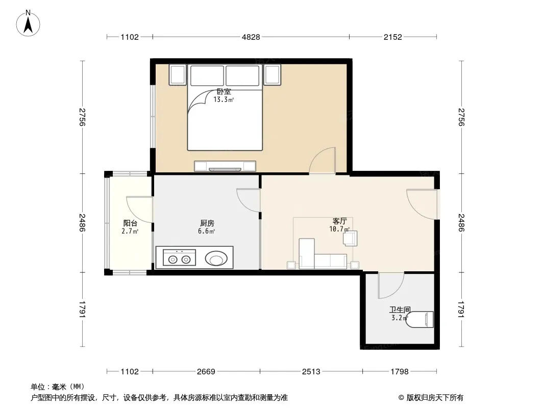 户型齐全,主打户型方正,明厨,客厅朝南,主卧朝南一居