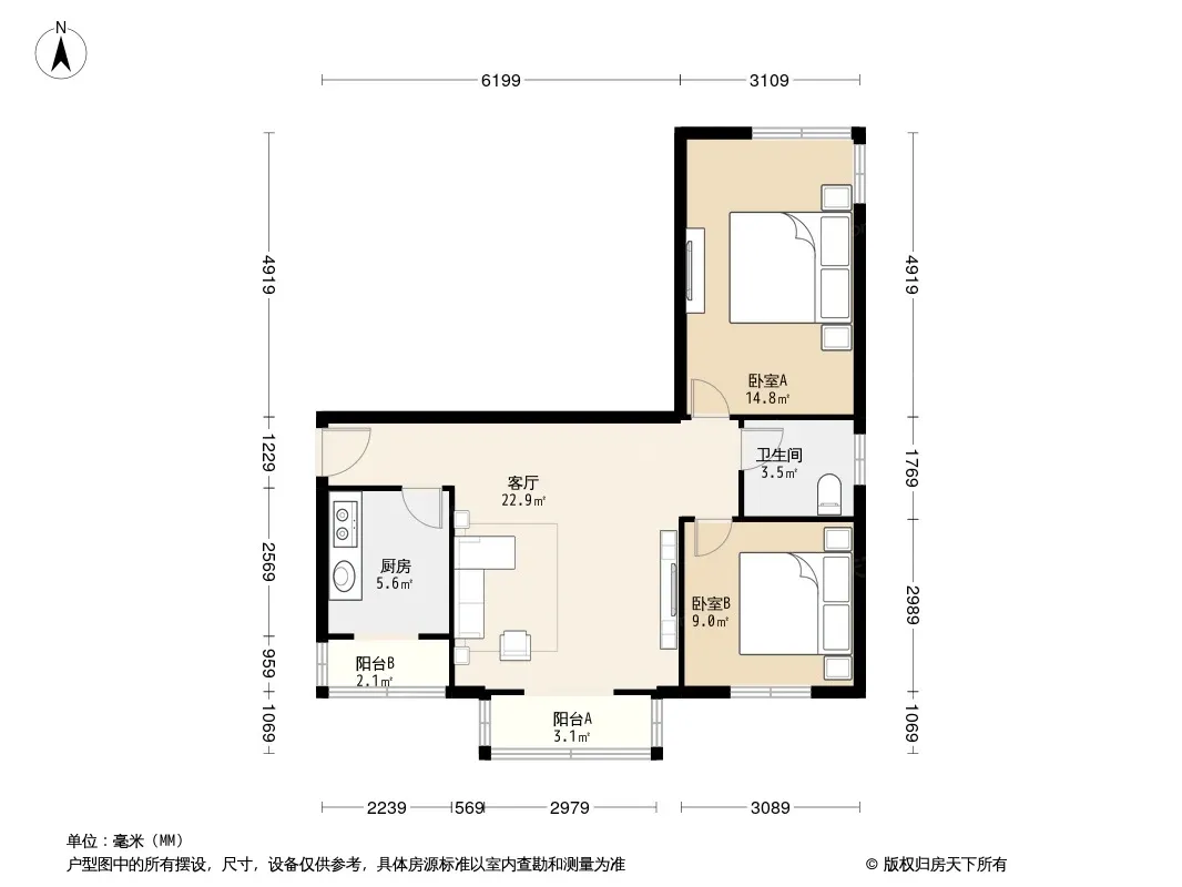 户型齐全,主打户型方正,客厅朝南,主卧朝南二居
