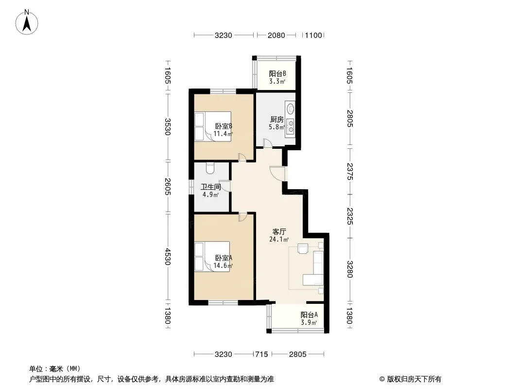 户型齐全,主打户型方正,客厅朝南,主卧朝南二居