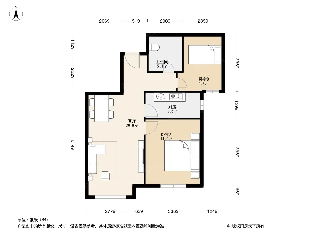 户型齐全,主打明卫,明厨,客厅朝南,全明格局,主卧朝南二居