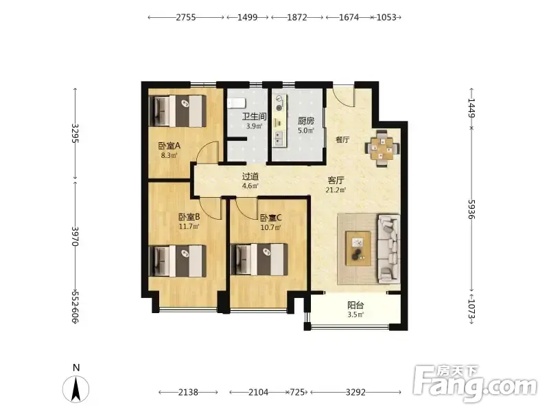 户型齐全,主打南北通透,全明格局,户型方正三居