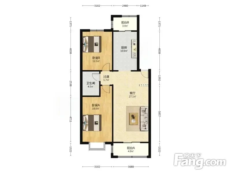 户型齐全,主打户型方正,明厨,客厅朝南二居