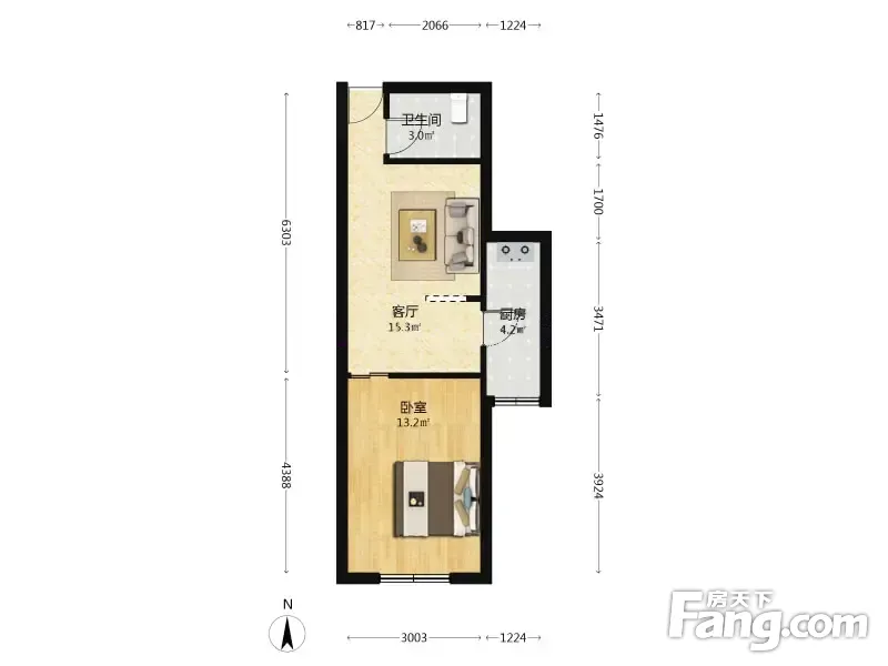 此房正规一室一厅一卫 卧室是标准房间带阳台 ,厨房卫生间都很方正,整齐布局合理,无浪费面积,住着舒服。产权清晰