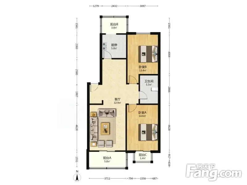 户型齐全,主打客厅朝南,双阳台二居
