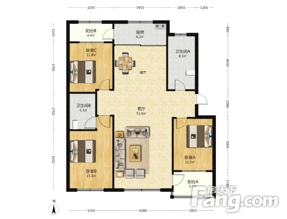 户型齐全,主打户型方正,明卫,明厨,客厅朝南,主卧朝南三居