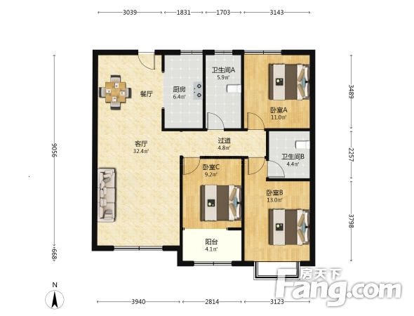 户型齐全,主打户型方正,明卫,明厨,客厅朝南,主卧朝南三居