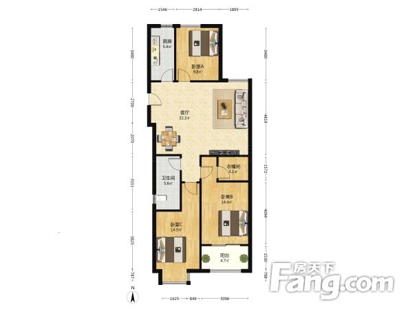 户型齐全,主打主卧朝南,卧室带阳台三居