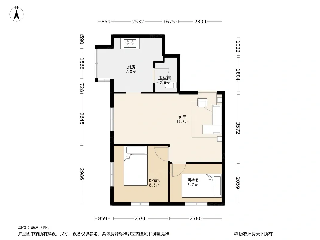 户型齐全,主打明厨,客厅朝南,双卧朝南二居