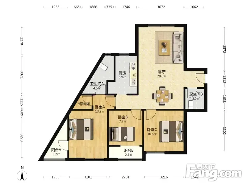 户型齐全,主打明卫,明厨,客厅朝南,双卧朝南三居