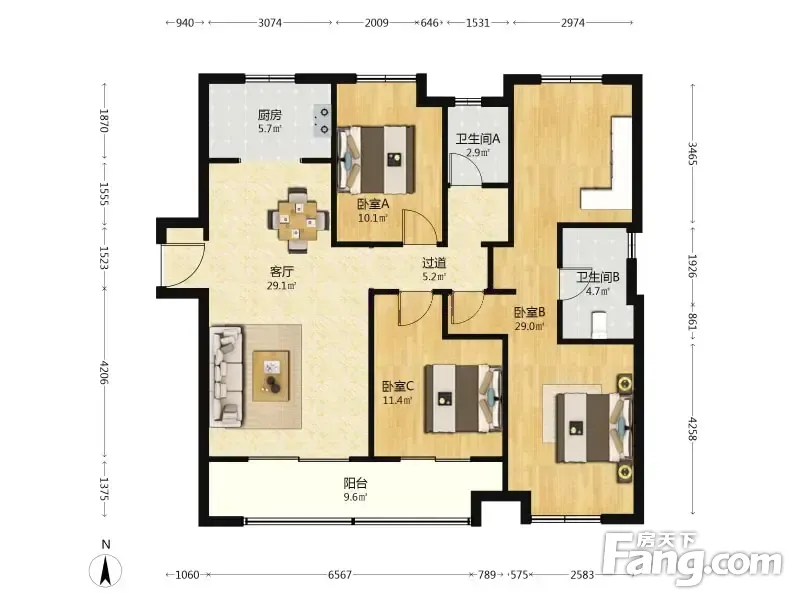 户型齐全,主打户型方正,明卫,明厨,主卧朝南三居