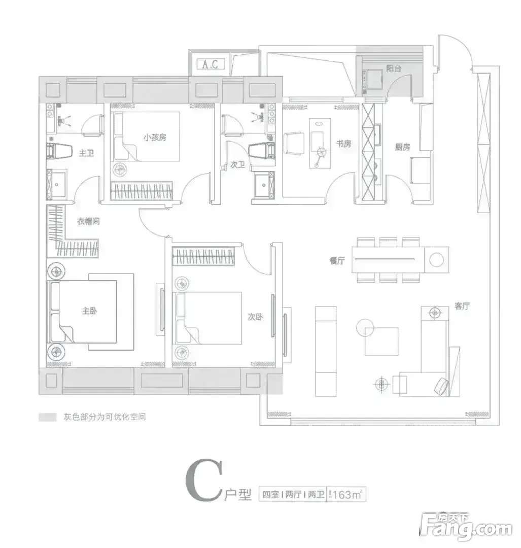 中国电建地产·洺悦江湾户型主要有163平-165平的南北通透,全明格局,户型方正,动静分离,观景落地窗的四居 。