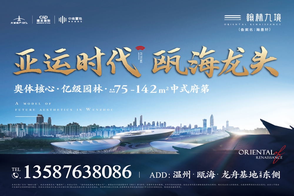 【大发.建发.中南翰林九境】瓯海中心区奥体板块.纯粹新中式.未来社区约156亩新中式未来社区大宅约58.8米宽五开间规制大门''''一场两馆''''瓯海奥体中心铝板+玻璃+石材干挂外立面瓯海中心区 第四代未来社区【翰林九境项目信息】【开发商】大发、建发、中南【项目规模】占地约156亩建面约30万方【交付标准】精装【楼栋信息】17幢22F-26F高层住宅(面积段】89-142m(少量75m)总户数】住宅2578套【物业】建发物业(资质)翰林九境作为瓯海中心目前 一个未来社区项目。其中,得益于未来建筑场景,户户都带有空中花园,不计