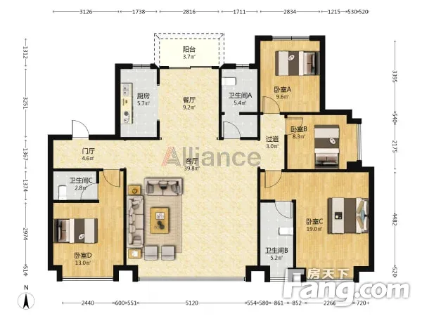 户型齐全,主打南北通透,客厅朝南三居
