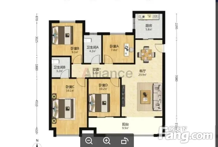 此房4房2厅2卫,两个房朝南,两个房间朝北,厅朝南带阳台。卫生间全明。 此房满三不满二,业主方税费比较少,只有1个点个税。 看房基本方便,提前预约基本都可以看到房子