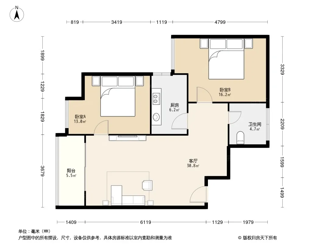 户型齐全,主打独立衣帽间,明厨,客厅朝南二居