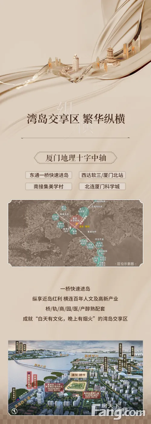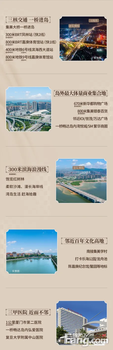 位于集美桥头位置,交通便利,不管是开车进岛,还是坐BRT、地铁(在建中)进岛内外都非常方便快捷;一路之隔就有一所幼儿园和小学还有一所九年一贯制的学校(规划中),步行上学方便;建发开发商,品质物业有保障,户型产品设计优,高层2梯3户,户户三面采光,洋房1梯2户,均有独立入户,户户空中花园。 看房热线:张137+2087+0023(WX同)全程专车免费接送,享团购优惠价