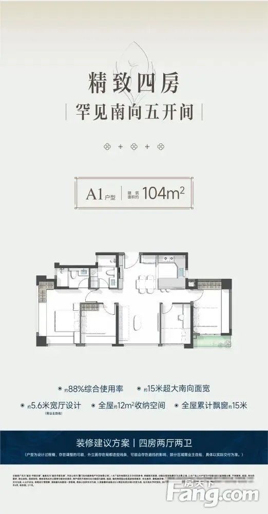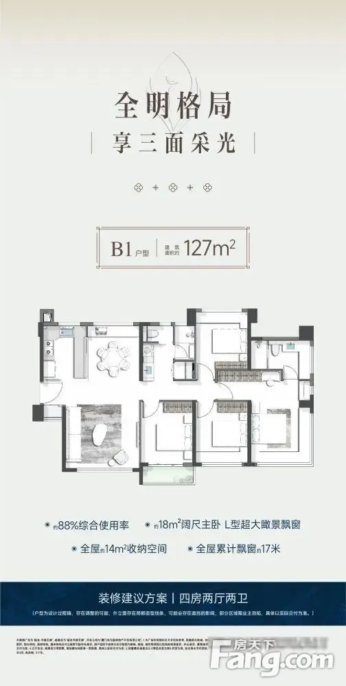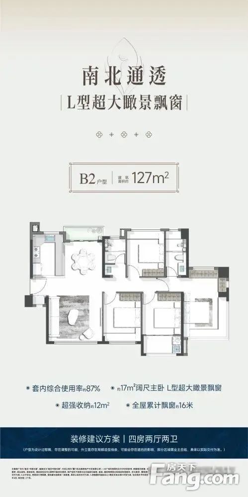 全岛内带双阳台的127平4房来了!1、套内使用率89%,比较市面传统140+二手;2、豪华主卧套,超大空间尺寸,两面 凸窗赠送; 3、幸福厨房,功能齐全转角斜切,长连续台面 4、南北双阳台,家政晾晒独立分区5、超强收纳24m3,占比套内11%项目有3大亮点:1.是岛内难得楼间距超70米,双大中庭,拥有约6m瀑布水景园林;2.五缘湾内