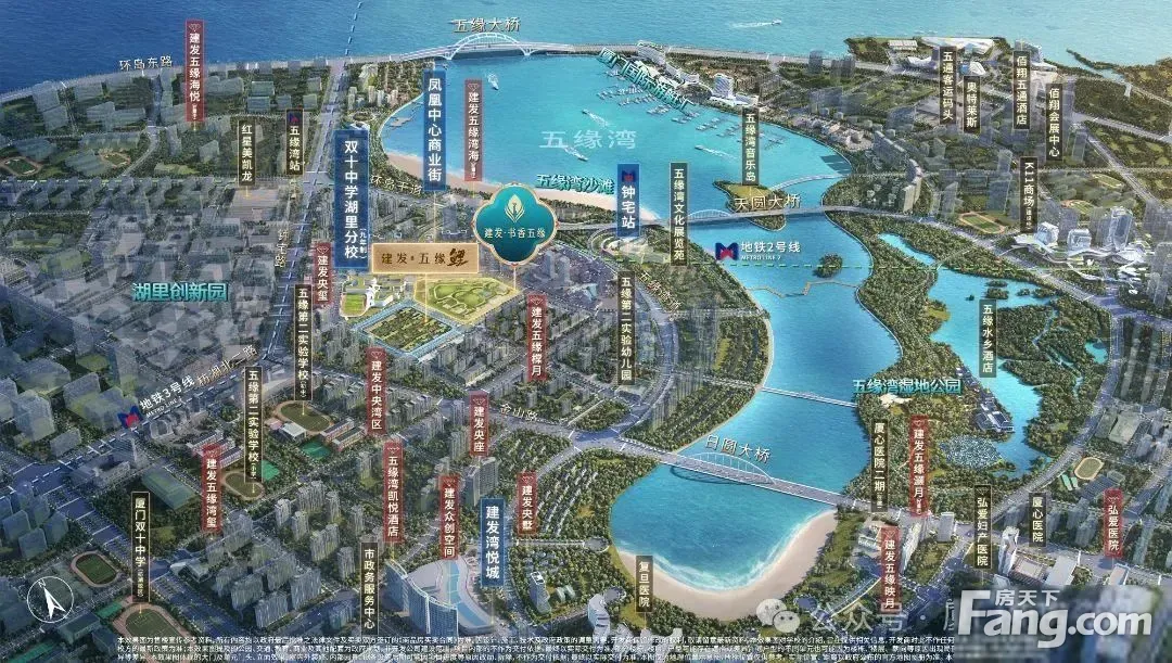 书香五缘地处五缘湾内湾优质位置,闹中取静,被自然、商业、文脉三重环绕,自然是指坐拥约85万㎡湿地公园与约54万㎡体育公园双生态绿肺,项目西北侧还有在建中的“街心”公园绿化带。商业有:湾悦城、凤凰商业街道,早上咖啡晚上酒吧、生鲜采买、商务宴请步行都可以解决;文脉有:双十中学湖里分校厦门优质教育资源为邻环绕