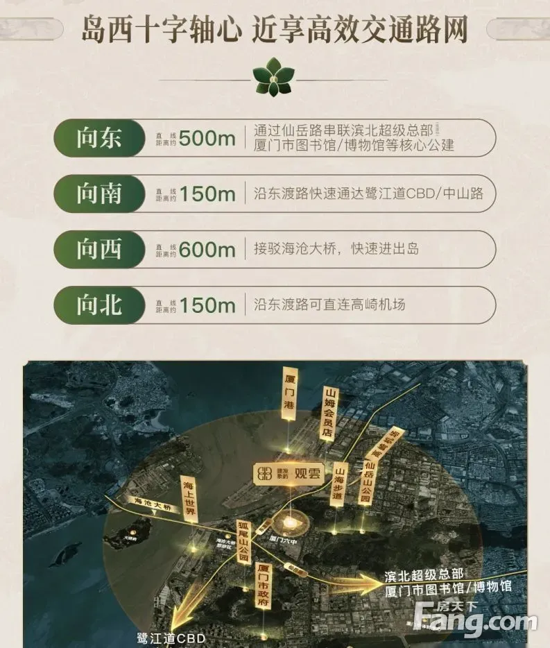 地段配套成熟 观雲位处岛内西部老城区,周边经历几十年发展,居住氛围成熟烟火气足,不像一些新板块还需要时间培养人气,且不临交通主干道闹中取静。 滨北城市中心,各项成熟配套和产业环绕周边,市政府,滨北超级总部区,厦门自贸区,海上世界购物中心,山姆会员商店,厦门市体育中心,厦门市图书馆,狐尾山公园……,均在2公里生活圈内。看房热线:黄186+5004+0198(WX同)全程专车免费接送,享团购优惠价