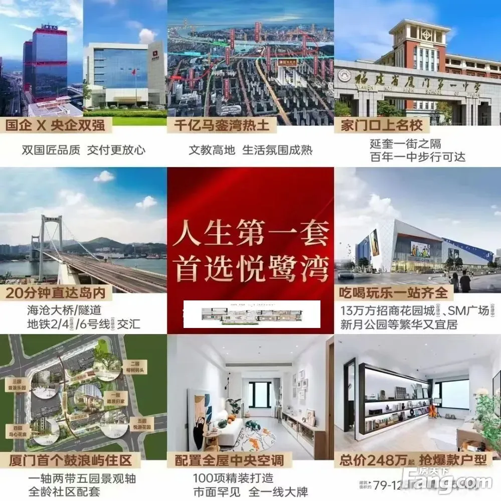 【联发招商·悦鹭湾】 看房热线:陈188+5055+3395(WX同)全程专车免费接送,享团购优惠价 开发商名称:联发、招商 产品类型:精装高层洋房住宅 楼栋分布:3栋洋房+3栋高层 梯户比:高层2梯5户 洋房1梯2户 产权性质:70年 装修情况:精装 层高:2.9米 总建筑面积:约7.5万㎡ 容积率:2.5 绿化率:约35% 总户数:540户 车位数:577个 车位配比:(1:1.06) 物业:招商积余物业 【低密生活住区 精装拎包入住】 约79-128㎡奢适3-4房产品,全明格局,高空间利用率。配置全屋中央空调、方太、科勒等一线大牌,考究品质入住即享。 【一轴两带五园 营造美好归家仪式】 萃取厦门鼓浪屿自然风光,以林、岛、浪、石作为景观元素,打造鼓浪屿风情主题景观轴营造归家主动线,构建踏浪归家、榕树码头、音浪乐园、岛心花庭、悦游花园等全龄段社区休闲配套。 看房热线:张137+2087+0023(WX同)全程专车免费接送,享团购优惠价