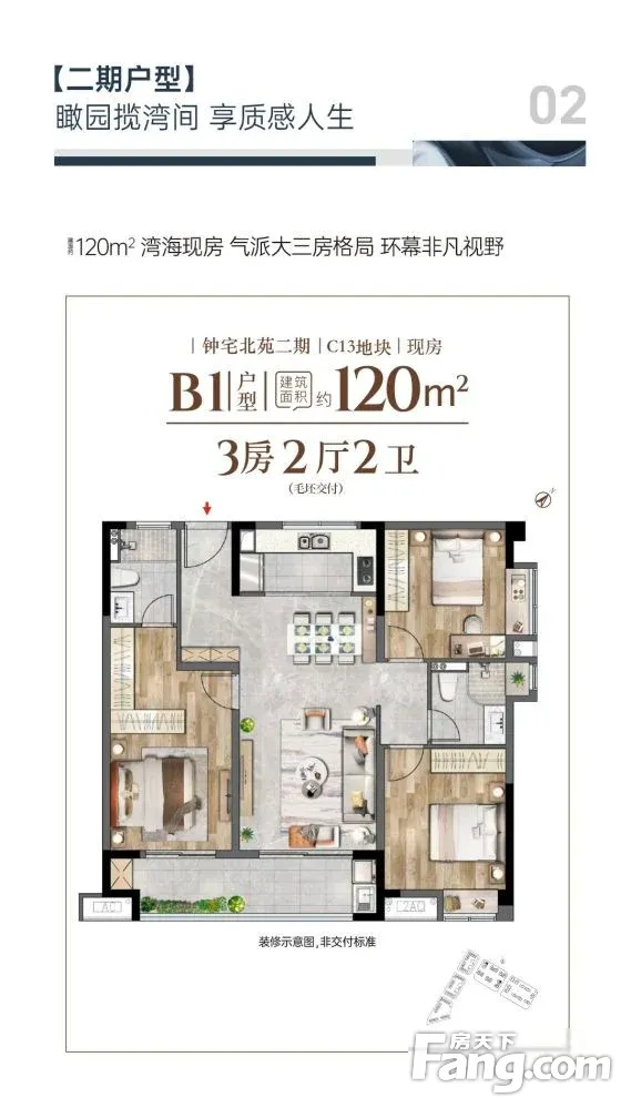 二、均好性之产品钟宅北苑外立面和公区,看起来和商品新房没有什么区别。同样400万预算,如果你实地看完钟宅北苑,你会对买过去二手房产生犹豫。你更希望买到人车分流的电梯房,你更希望买到多个卫生间的3房,你希望小区权益受损时有人替你出头,你希望20年后你买的房子依然如新....钟宅北苑提供了多种户型选择,以二期B1户型为例,正规3房2卫户型,两梯3户,全明格局,超大阳台,奢阔主卧,一家人其乐融融。这样的小区品质,明显强于其它二手小区。而同样的景观,对比旁边的五缘湾海,价格则便宜许多,对于预算400万的改善群体而言,性价比很高!全程专车免费接送,享团