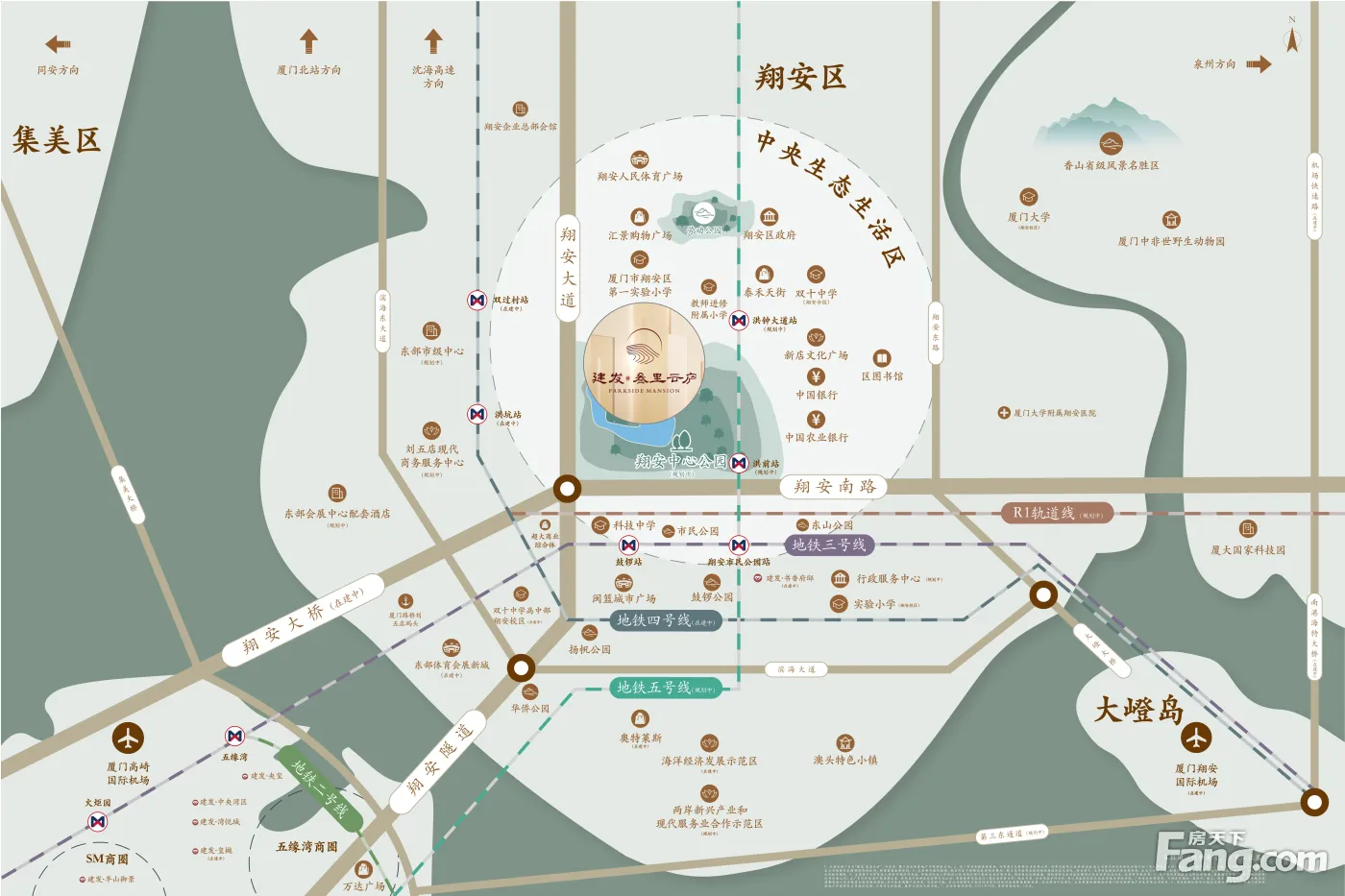 【景观资源】占据翔安城芯,约34.01万㎡翔安中心公园(规划中),计划建设成原乡文化的传承地、生态保护的示范地、运动康体活动区和休闲游憩大公园。早晨掀开窗帘,可以享受到家楼下翔安蕞大中心公园带来的鲜氧因子与愉悦心情,这里不仅三餐有景,更是四季有花,一年常青。 【交通出行】厦门进岛双通道(翔安隧道\翔安大桥)交汇区域,开车约15极速进岛;地铁3号线鼓锣站、地铁5号线(规划中)、厦门翔安新机场(在建中) 看房热线:张137+2087+0023(WX同)全程专车免费接送,享团购优惠价