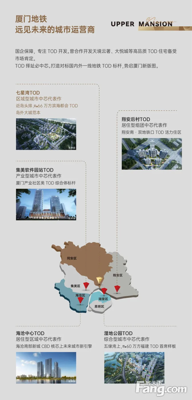 {七星湾TOD·璞盛} PART3 十年一剑,TOD要造城市中心? 因为这些利好,66万㎡的七星湾TOD·璞盛才会这样万众瞩目,成为厦门为数不多未开先火的红盘。 除去厦门已近10年没有这样规模超级大盘的缘故,市场判断,这一次TOD可能是要打造一个新城市中心。 这里就不得不说,七星湾TOD·璞盛岛外首区域统筹型TOD定位。 区域统筹型TOD,顾名思义不仅要带来“住宅-商业-轨道出行”综合生活,更重要的是要肩负更新城市板块的重任,甚至可以说是通过造城来赋予板块新生命。 区域统筹型TOD将融合居住、购物、交通、办公、教育、休闲、娱乐等生活形态于一体,站在城市高度来打造新中心。 作为区域统筹型TOD,七星湾TOD·璞盛带来三个超级造城元素: 超级商业:8万㎡一站式集中商业,带来更多美好生活可能 大社区自带8万㎡一站式集中商业,是厦门新城海岸线,甚至在岛外新城高居前列。 集中式商业配套,让未来居民从此不用再像老环东那样,住宅区远离商业区,逛个超市都要舟船劳顿。就像岛内五缘湾核心区的湿地公园TOD一样,可以充分享受家门口的一条龙生活配套。 看房热线:张137+2087+0023(WX同)