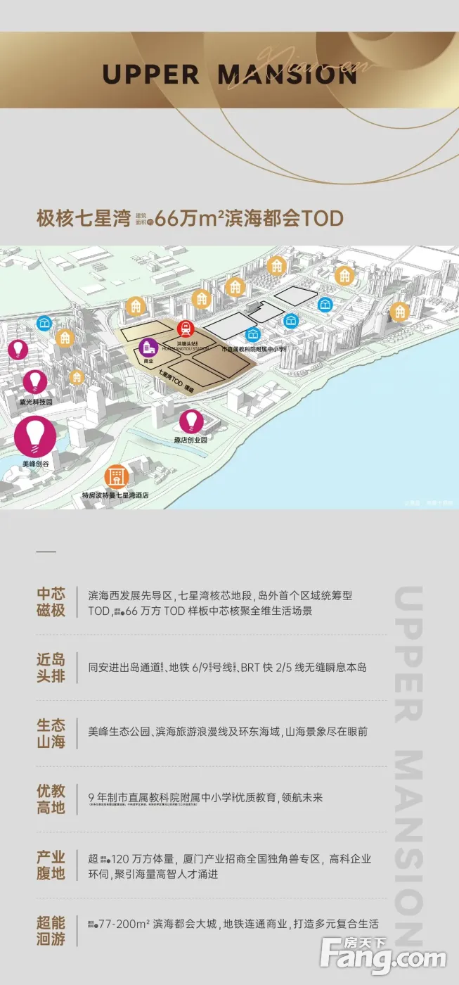 厦门东海域的——七星湾TOD·璞盛。 有人说这个盘周边地铁、海景、沙滩、酒店、高新产业、商业、学校一应俱全,又有66万㎡的超大体量,还是代表城市未来趋势的TOD综合体。如果对比十年前集美新城拓荒者的中航城、水晶湖郡,可以说是含着金钥匙出生。 它真有那么好? PART1 想打造海湾大城核心,凭什么? 在七星湾海岸线上,不仅完成了人工沙滩,完成了红树林景观带,完成了海岸长堤和彩虹慢跑道,而且已开业包括特房波特曼七星湾酒店、万丽酒店、万豪酒店等五星级度假酒店。包括美峰生态公园、体育公园、彩虹沙滩儿童 看房热线:张137+2087+0023(WX同)全程专车免费接送,享团购优惠价