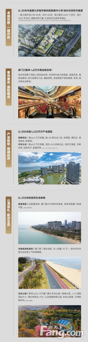交通:同安美峰片区开车走滨海西大道有限速,集美大桥引桥段易堵,6 号线地铁 ( 洪塘头站 ) ,未来规划同安进出岛通道。地理上比虚高的厦实三盘和银城智谷离岛更近。 配套:附近目前无医院、图书馆、体育馆等公建。项目自带8万平大型商业体,此前传言华润意向输出管理。距离最近的阳光小镇商业项目是比较惨淡的,整个滨海片区的商业体热度还是过低,需要在招商上下工夫。 学区:配建 1 所 15 班幼儿园,九年制教科院附属中小学 ( 小学 48 班、初中 48 班预计能提供 4560 个学位)。 环境、产业、交通、教育……厦门人看好的万事俱备,都在这里。 看房热线:张137+2087+0023(WX同)全程专