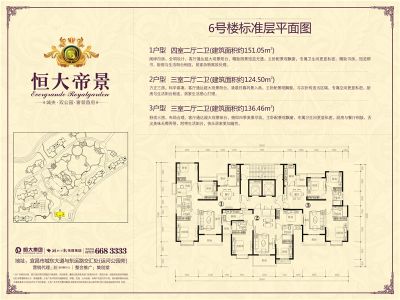恒大帝景户型主要有117平-125平的明卫,双阳台的三居 、72平-78平的全明格局,户型方正,采光充足的一居 、150平-151平的南北通透,飘窗的四居 。