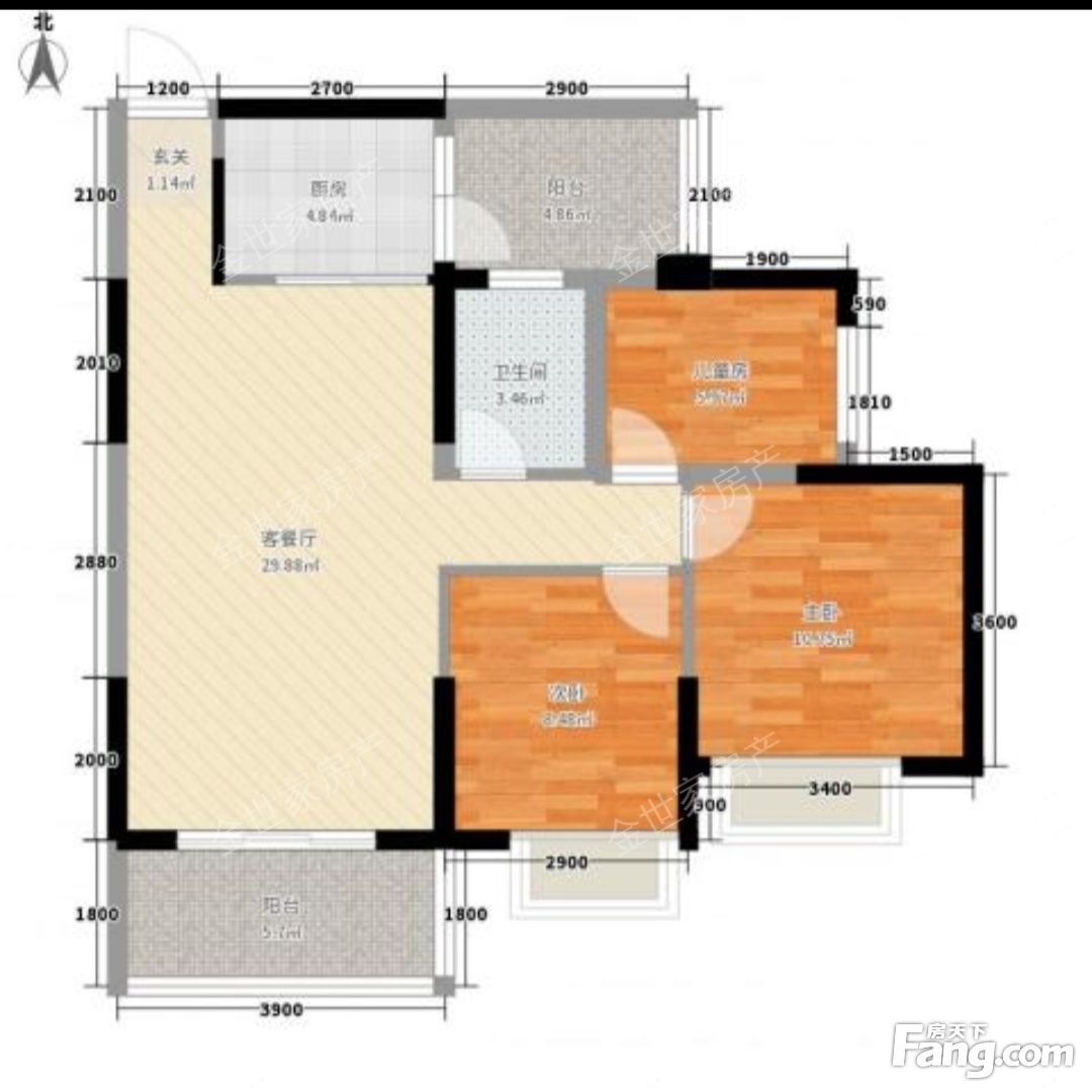 三房两厅两卫,坐北朝南。户型方正,主卧、客厅向南采光好!