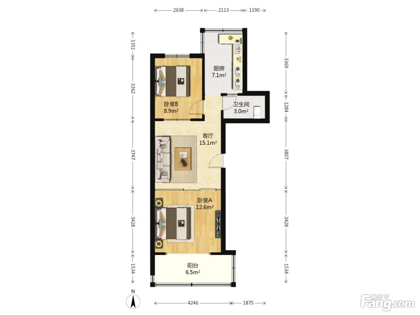 户型齐全,主打户型方正,明厨,主卧朝南二居