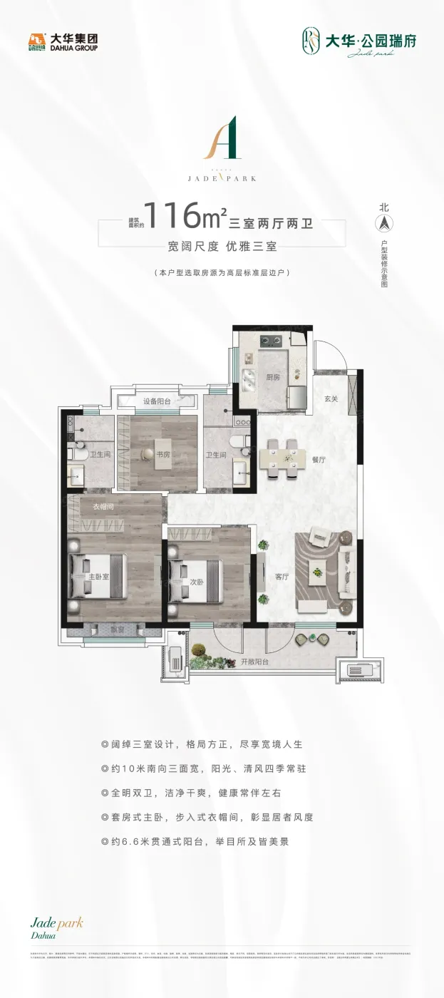 大华·公园瑞府户型主要有96平-116平的南北通透,全明格局的三居 、114平-130平的南北通透,全明格局的四居 。