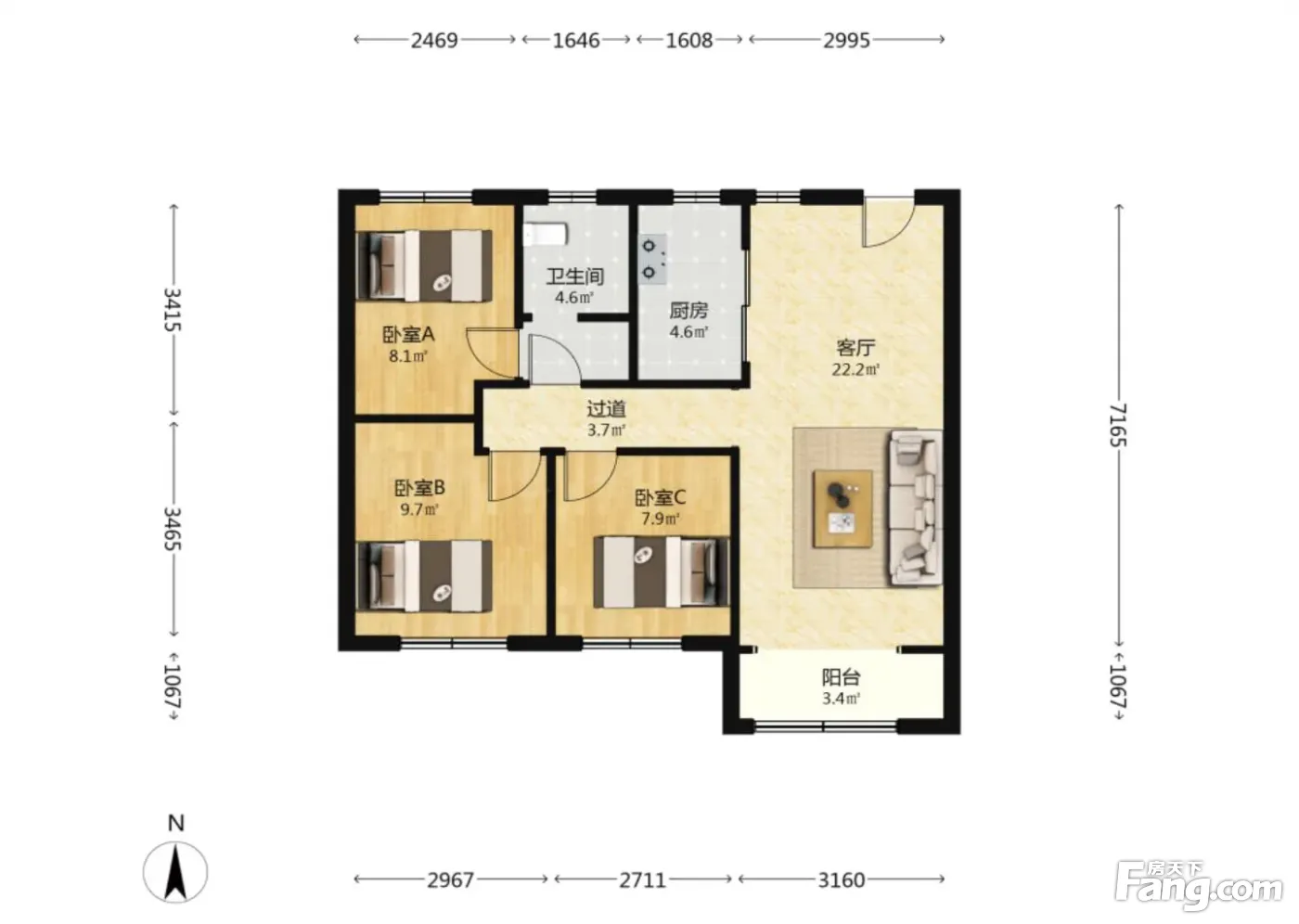 户型齐全,主打南北通透,客厅朝南,主卧朝南,卧室带阳台,双阳台三居