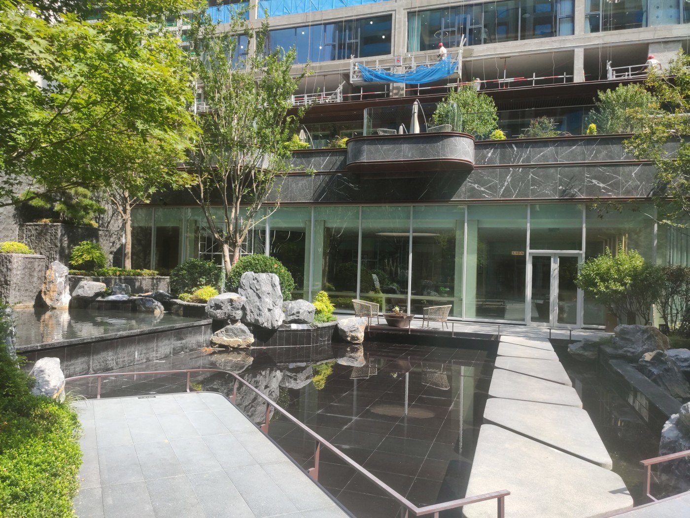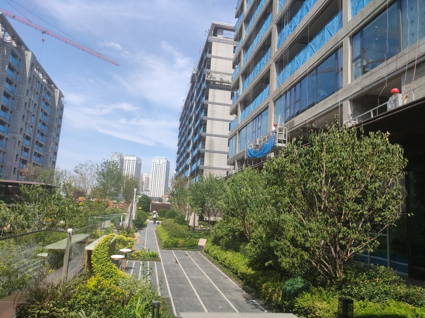 拥有高颜值外立面现代轻奢风格,镜面靓丽。光幕美学立面,一二层为石材,上部为水包砂灰色真石漆的沉稳与浅米色真石漆的温馨,局部细节深香槟金色铝条点缀 会所特邀请了绿城设计院操刀进行了优化提升 车库入口和单元大堂都采用铝板吊顶,顶面的设计巧妙地结合了镜面星空顶,车行道采用灯带感应。车库行车道我们用了永远不开裂、不掉色、恒久弥新的材质:超镜面彩磨石固化地坪;停车区:镜面固化地坪。 社区大门、地上单元门、地下单元门、楼层单元间,归家尊崇由此开启。我们项目采用地上、地下精装双入户大堂的设计,增加入户仪式感,坚持星级精工品质,进户门也采用大尺度开间(子母门)