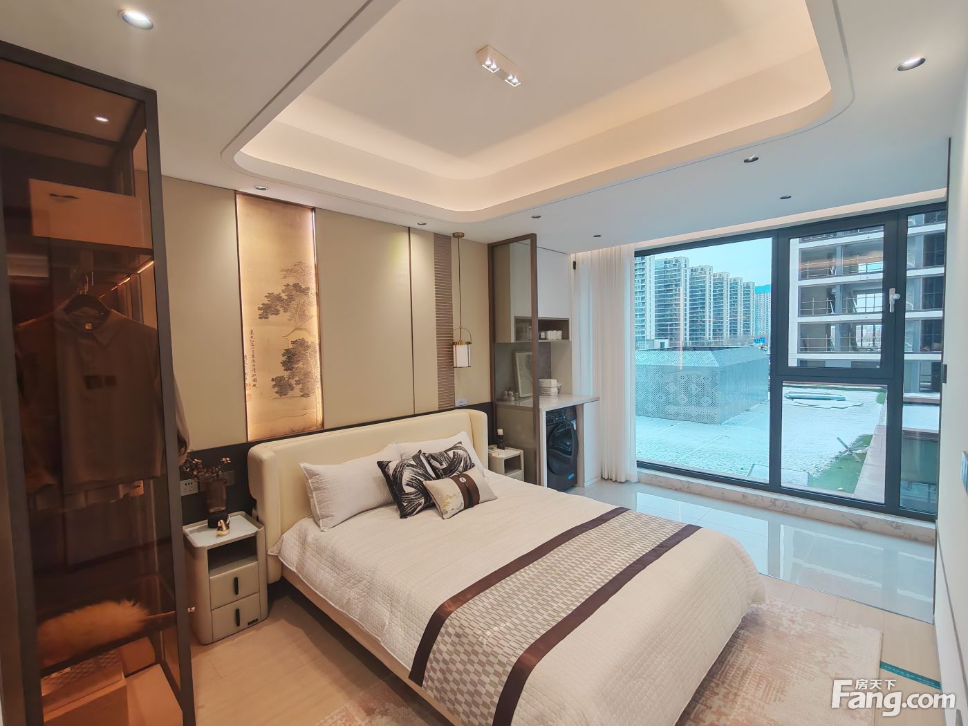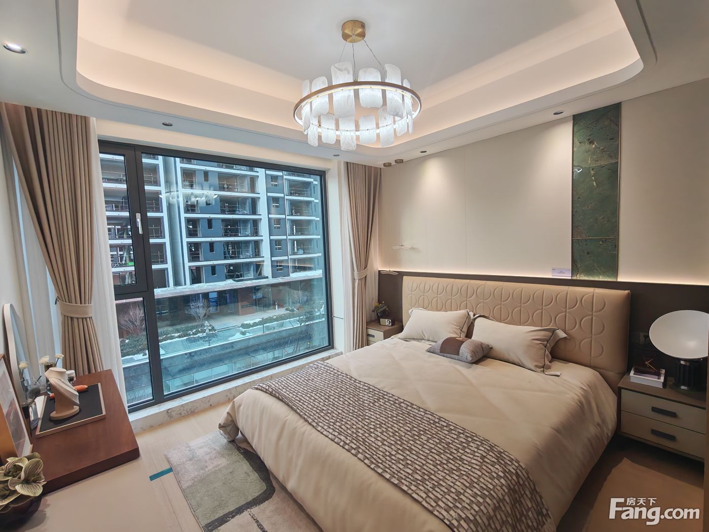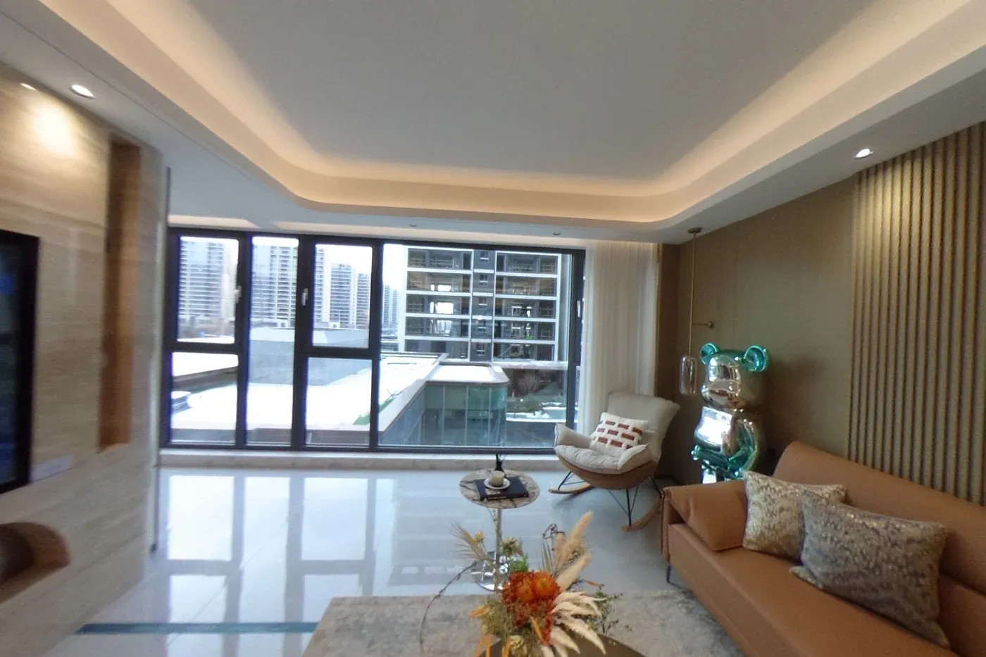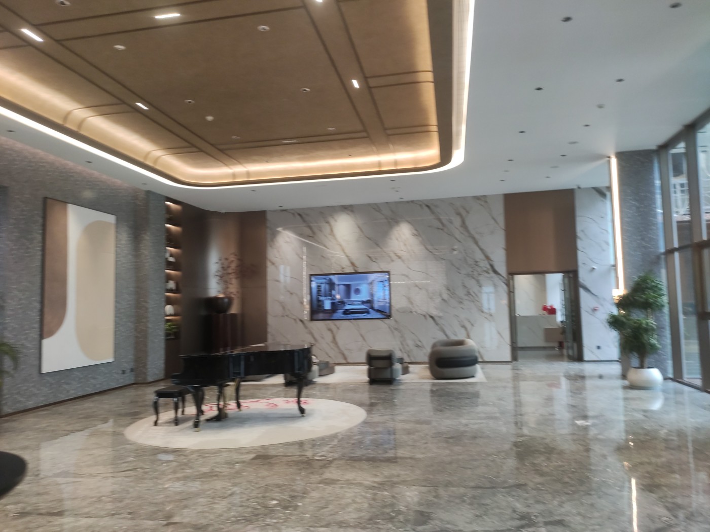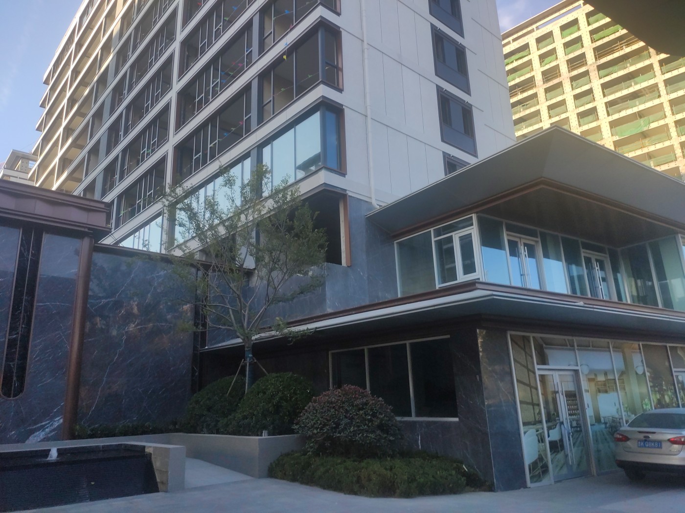 拥有高颜值外立面现代轻奢风格,镜面靓丽。光幕美学立面,一二层为石材,上部为水包砂灰色真石漆的沉稳与浅米色真石漆的温馨,局部细节深香槟金色铝条点缀 会所特邀请了绿城设计院操刀进行了优化提升 车库入口和单元大堂都采用铝板吊顶,顶面的设计巧妙地结合了镜面星空顶,车行道采用灯带感应。车库行车道我们用了永远不开裂、不掉色、恒久弥新的材质:超镜面彩磨石固化地坪;停车区:镜面固化地坪。 社区大门、地上单元门、地下单元门、楼层单元间,归家尊崇由此开启。我们项目采用地上、地下精装双入户大堂的设计,增加入户仪式感,坚持星级精工品质,进户门也采用大尺度开间(子母门)
