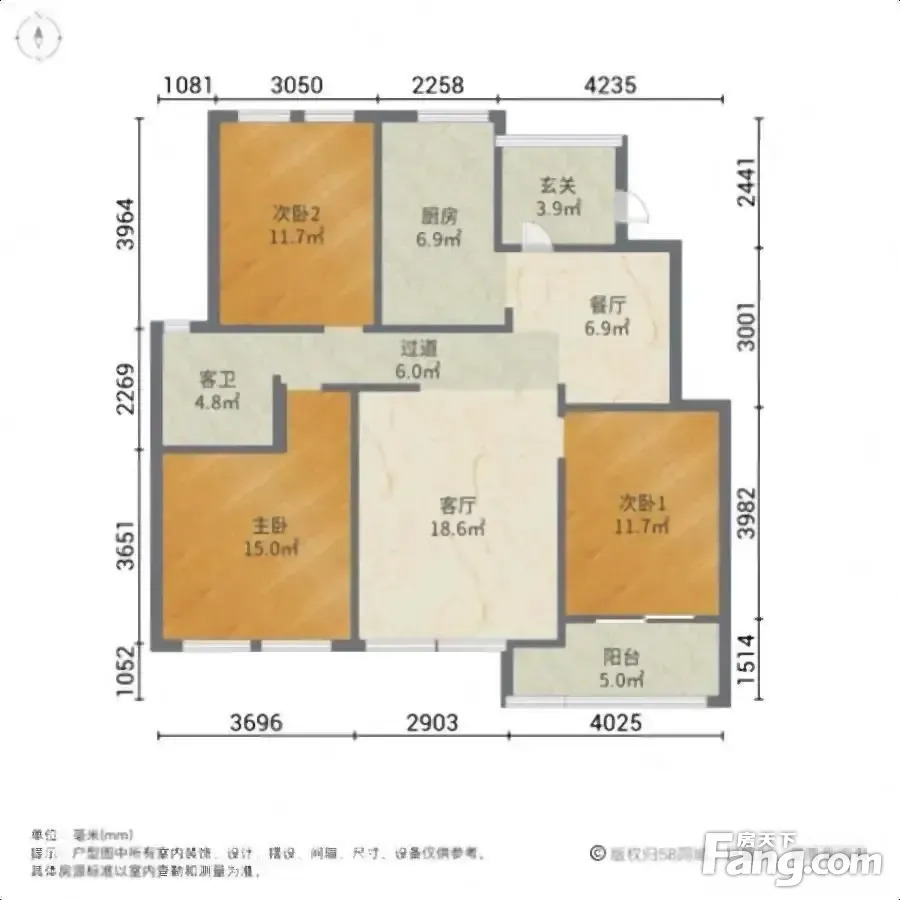 户型齐全,主打主卧带卫,户型方正,客厅朝南,主卧朝南三居