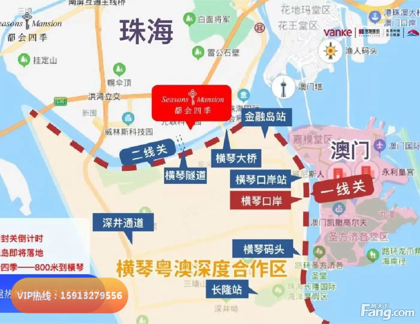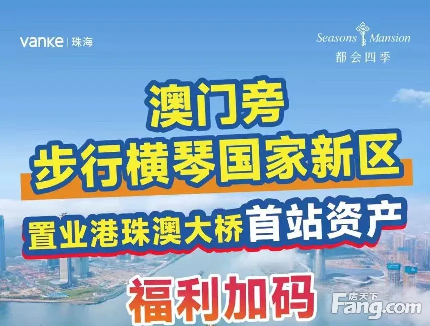 1、万科横琴【都会四季】项目地处珠海横琴新中心,规划的横琴中心级总部基地; 2、是区域内70年产权的住宅项目,3线上盖,距离珠海地标新经济总部大厦约500米 3、距离港珠澳大桥落桥点1.5公里,距离金融岛(澳门证券交易所)3公里 4、横琴口岸5公里;楼盘占地8.13万平方米 5、一共有13栋高层住宅+4.5万方印象城购物中心+配建有首都师范附属。 1、户型有68平米的两房 2、79平米的南向3房2卫 3、89平米的南向3房2卫 4、99平米的南北通4房2卫,送全屋装修