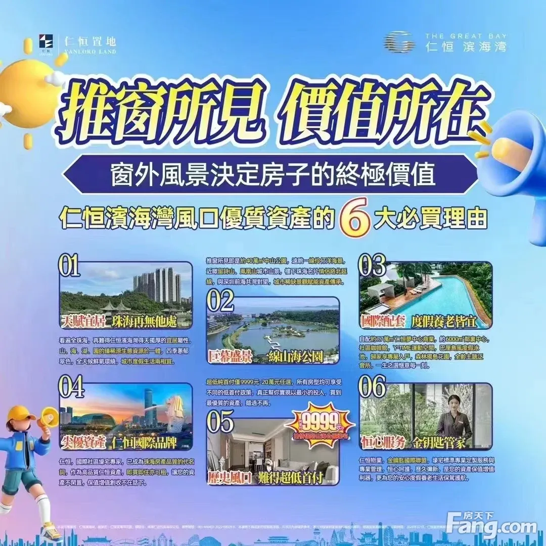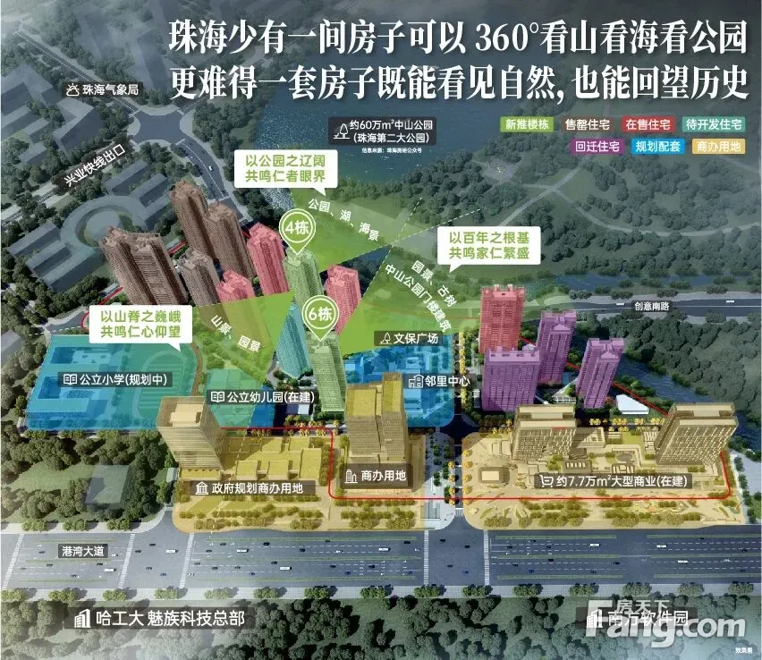 自有商业仁恒梦中心,打造国际化SHOPPING MALL 3km内宝龙城、港湾壹号等商圈,都市繁华生活圈触手可及 约60万㎡中山公园,一线IMAX公园景观 拥伶仃洋海景、留诗山脉,缔造山海共享体验 紧邻情侣北路北延线(建设中),串联珠海各大地标