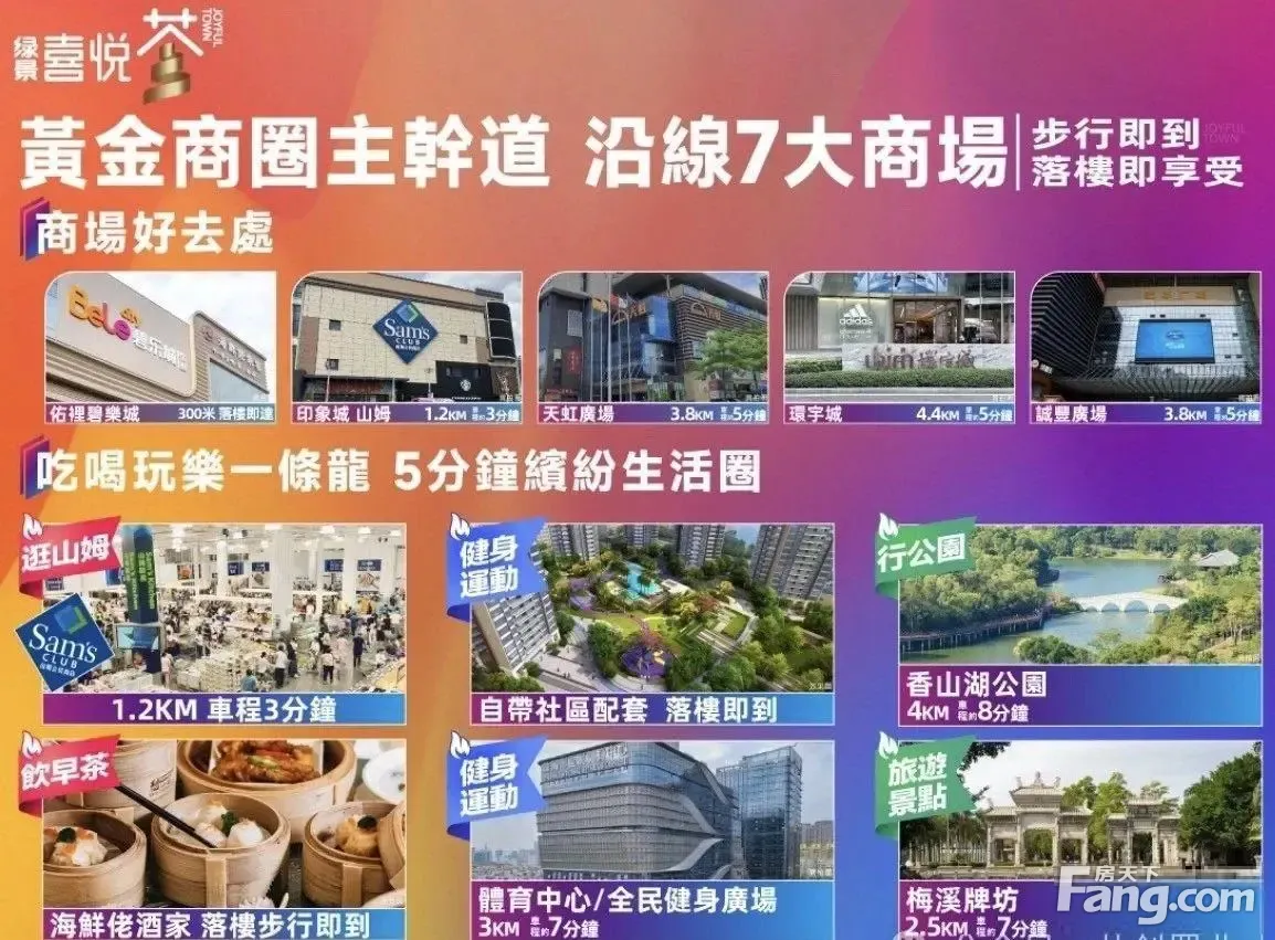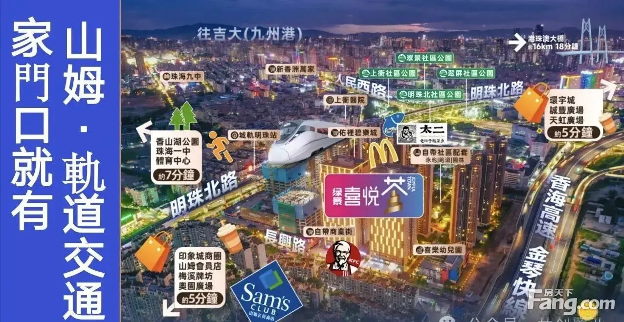 山姆旁.5X萬.軌道商業雙上蓋物業 綠景喜悅薈約44-57㎡(474-614呎)精裝現樓即買即住即 總價5X萬低總價.高回報 港車北上宜居珠海 香港上市 多維立體交通珠海主幹道18分鐘到達港珠澳大橋口岸.5分鐘上高速(香海高速金琴快線) 軌道商業雙上蓋出行輕軌.通達全國 珠海主城區黃金商圈主幹道沿線7大商場 山姆旁步行可到落樓即享多個商圈.5分鐘繽紛生活圈 自帶商業街.社區配套