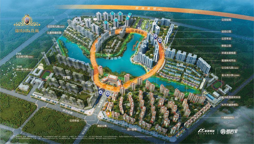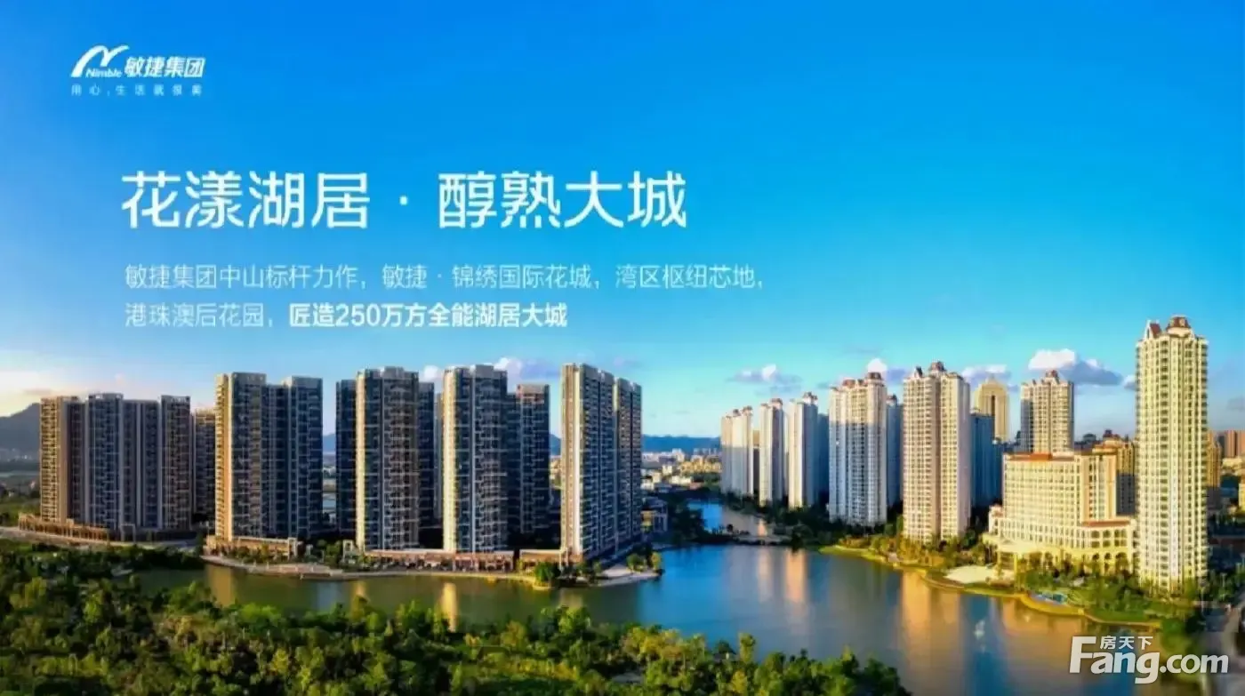 【锦绣国际花城】是百强房企敏捷集团打造的千亩醇熟湖景宜居标杆大城。项目坐落于中山市坦洲镇环洲北路9号,占地约1500亩,共分五期开发,历经11年现已开发至第五期,洋房、商业公寓、商铺产品一应俱全。项目拥有中山、珠海区域的300亩原生态湖景资源4公里的环湖跑道,另外项目设置公交总站,岐关巴士(A线)珠海吉大、香洲、拱北;项目拥有区域内的三所公立 和两所公立 ;小区内有7000㎡康体会所拥有室内外恒温双泳池以及社区运动公园,运动公园里面配备运动设施、篮球场以及羽毛球场, 身材塑造必不可少。现社区已有超万户业主入住, 品牌物业服务,社区居住氛围浓厚。