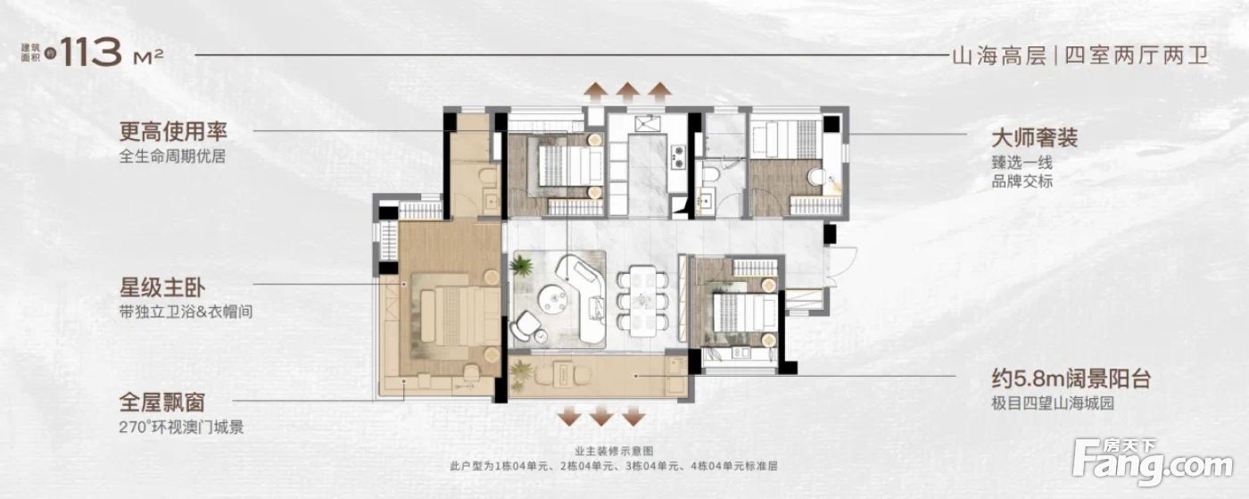 华发·湾玺壹号户型主要有113平-185平的南北通透,户型方正,采光充足,三开间朝南,主卧带卫,U型厨房,大面宽阳台,带露台的四居 。