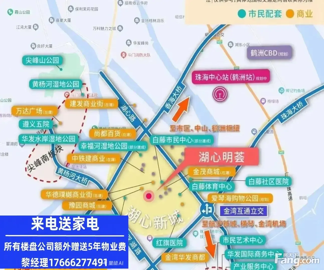 中:8所,4所,项目周边5km内已有金湾、白藤湖、城南中、珠海、红旗等 :15所, 商场:家和城广场、爱琴海购物中心(在建)、金茂商业(在建)、豫园商业(在建)四大商业体,总计过30万方,购物休闲娱乐尽享。