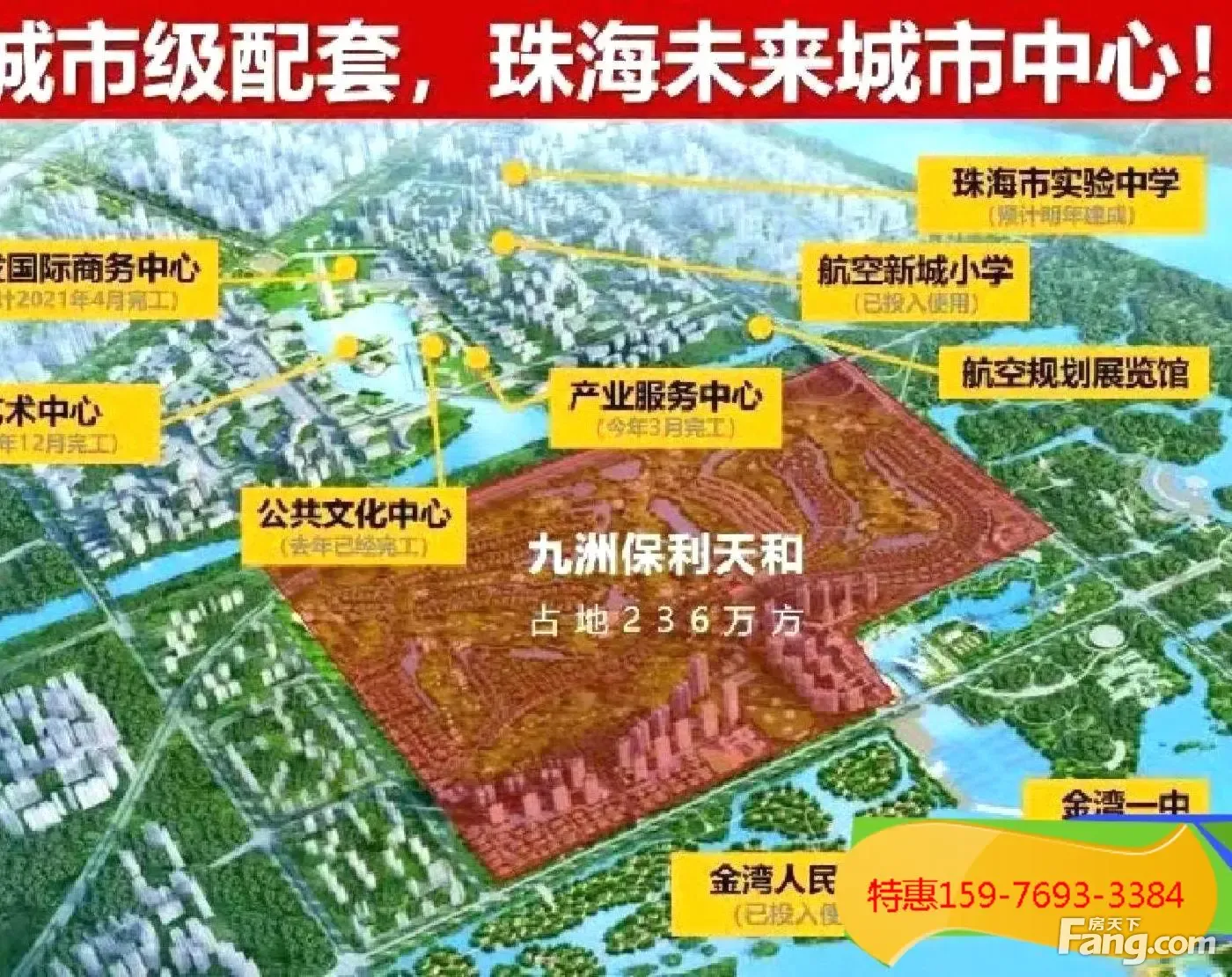 【项目地址】珠海金湾机场东路金湾高尔夫 【开发商】国企『九洲』?央企『保利』 【项目占地】236万㎡(高尔夫球场用地136万㎡,建筑占地100万㎡) 【项目建面】100万㎡(90万㎡住宅,10万㎡配套) 【项目容积率】1.0 【项目产权】70年 【项目总户数】约6500户 【项目规划】总共分五期开发,产品规划为高层、洋房和别墅