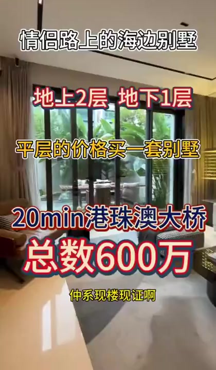珠海情侣路上的别墅,总价600万,首期30万,精装毛坯可选 219m²4房,地上有3层,送露台,送车位 233m²下叠4房,地上2层,地下1层,独立花园,送车位 项目亮点:低总价圆一套别墅梦 ? 70年产权别墅住宅,带独立花园、独立电梯,现楼交付! ? 背靠凤凰山森林公园,出门海滩、情侣路,近日月贝、扬名广场、中大五院等,周边围绕着四大公园!