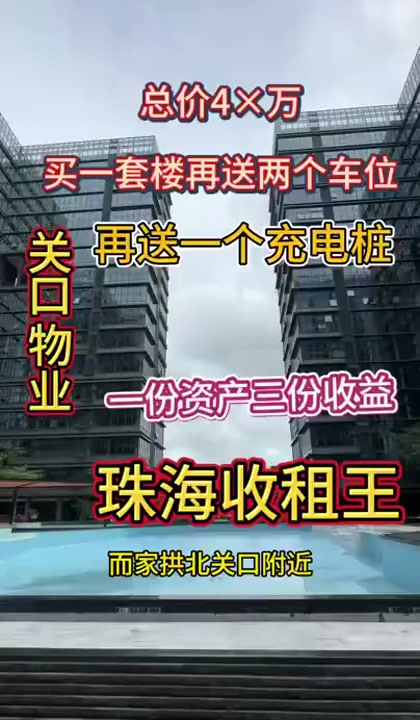 珠海市区王!总价49万!买到赚到 主推户型:40-43m2精装小面积 月2000,车位600,一份资产三份收....租 项目亮点: 1、项目托管8%,租金直接覆盖月供,送2个车位、充电桩1个,躺着赚钱! 2、家门口就有公交巴士,近港珠澳口岸、横琴口岸、湾仔口岸,轻松往返香港、澳门! 3、楼下有底商,近享华发商都、环宇城、富华里等商圈、近奥特美健身房! 4、小区内配有泳池,一线濠江景,就是澳门横琴夜景!