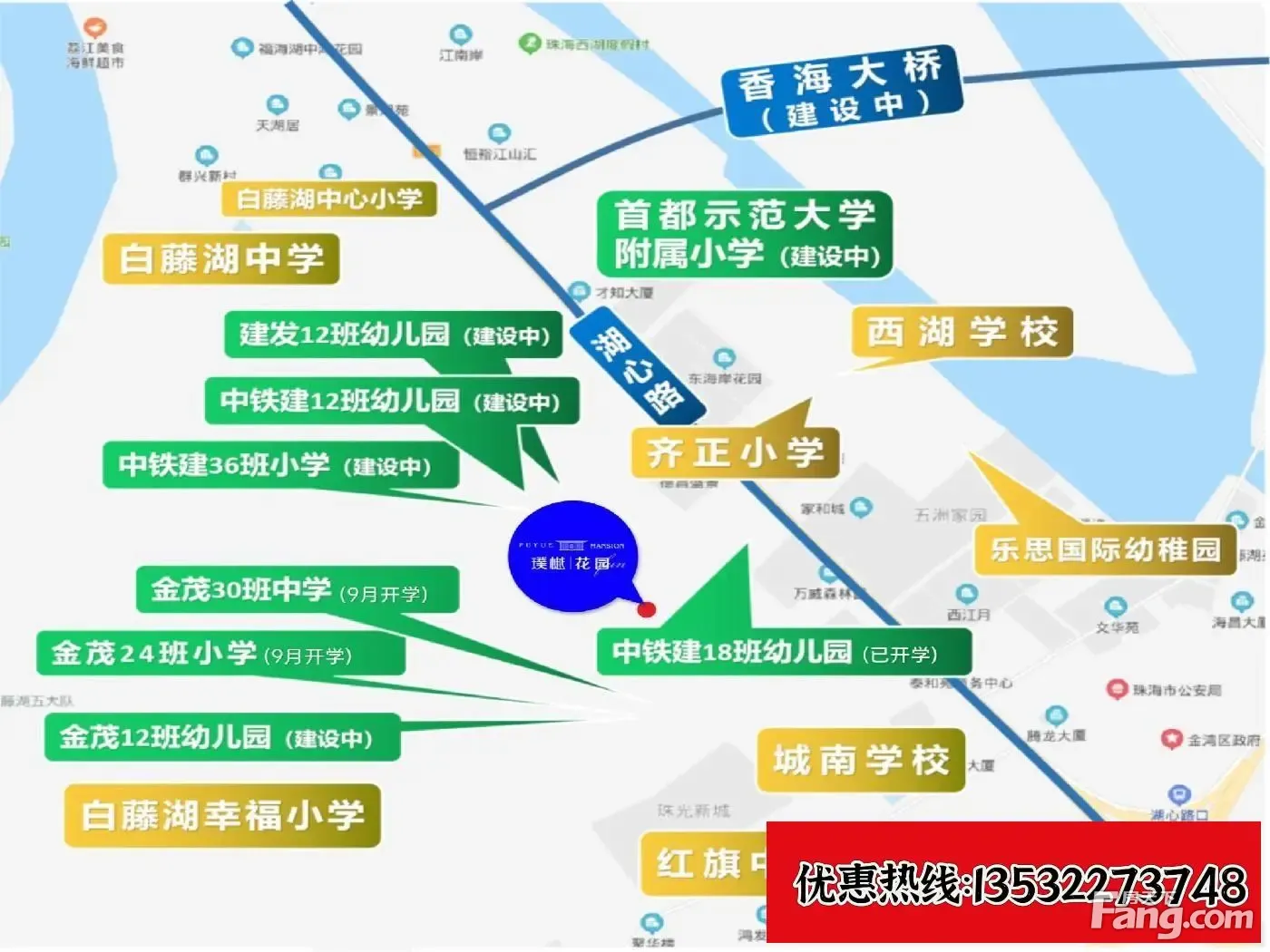 :珠海艺术学院、珠海城市职业学院、吉林珠海学院 中:华中附属金茂(公办)、华中附属金茂(公办) :行知(公办)、 商场:商业配套:3大商业旗舰环伺,将簇拥约30万㎡商业体